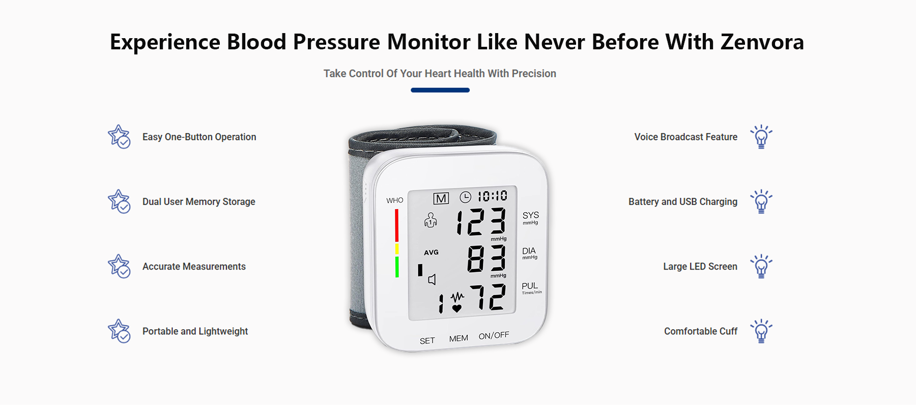 Experience hospital-grade accuracy in the comfort of your home. Zenvora provides professional blood pressure monitoring with advanced technology and user-friendly features.